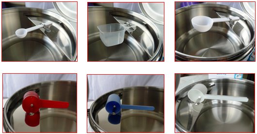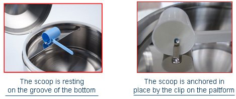The platform, the groove and the clip are also specially designed so that they will not scrape the scoop during the scoop-levelling process or when the scoop rotates on the platform groove.