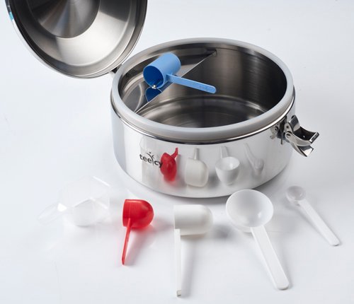 The measuring scoop is always held securely and neatly on the platform inside the container and yet keeping it permanently out of contact with the powder in it.